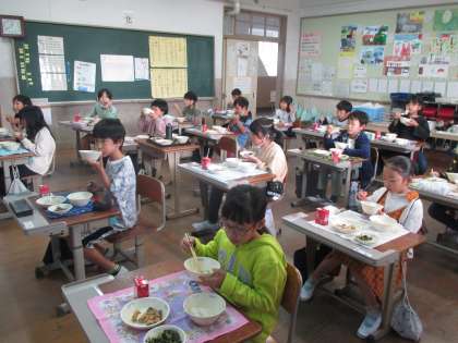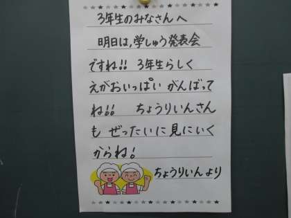 今日は3年生の教室で給食を食べた校長先生です。黒板には,1枚のお手紙が。給食調理員さんからのものでした。明日が学習発表会なので,「がんばってね!」というメッセージが書かれていました。とっても嬉しいお手紙ですね。いい気持ちで給食を食べました。
