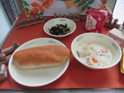 11月16日(火)の給食は,全粒粉のパン,牛乳,きのこのクリームシチュー,ひじきのソテーでした。1・2年生の教室からは,「きのこにがて〜」という声があちこちから聞こえてきましたが,「でも,たべてみる…」といって全員のこさず食べることができました。中には,「きのこにがてだけれど,おいしかった!」「いがいと,おいしい!」という声もありました。にがてな食べ物も,がんばって食べてみよう!と思えるのは,どんな食べ物もおいしく変身させてしまう調理員さんのまほうのおかげかもしれません…。