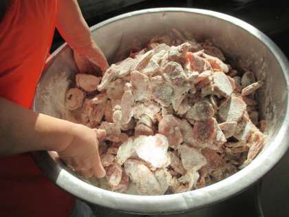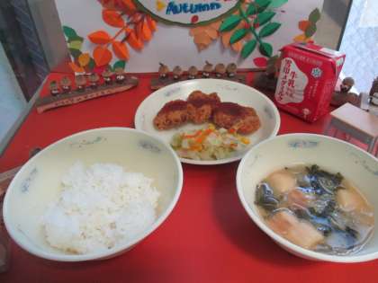 調理員さんは,お肉に衣をつけるときに,「こ,腰がいたい〜!!」と言っていました。ひ口先生は,お肉がつめたすぎて指の感覚がなくなりそうでした。それでも,みんなの喜ぶ顔が見たくて,一生懸命つくりました。・・・おいしかったかな?