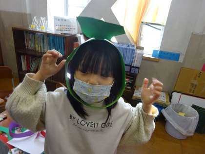 画用紙でわっかを作って,そこから さらに 手をくわえて,へんしんしてみました。