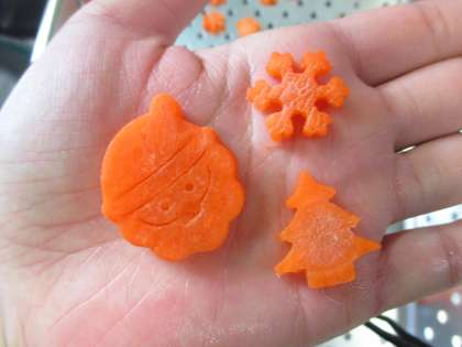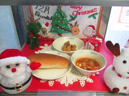 12月14日(火)の給食は,ミルクコッペパン,牛乳,スパイシーチキン,ミネストローネでした。スパイシーチキンは,にんにく,ヨーグルト,カレー粉,塩こしょうを合わせた中にしばらくつけておき,片栗粉と米粉をつけて油であげています。「スパイシーでおいしい!」という感想をたくさんいただきました。イタリアの家庭料理であるミネストローネは,イタリア語で「具だくさんのスープ」という意味があります。今日のミネストローネには,たっぷりのホールトマトと野菜,ミックスビーンズなどをいれて煮込んでいます。そして,もうすぐクリスマスということで,クリスマスキャロットを作りました。サンタと,ツリーと,クリスタルです!
