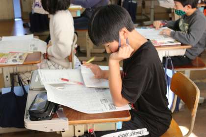 社会科で『情報産業とわたしたちのくらし』の学習をしています。今回はニュースが一日にどれくらい,どの時間帯に放送されているのか,テレビ欄を見ながら探してみました。今まで気にしたことがなかったこともあり,子どもたちは必死にテレビ欄を確認していました。子どもたちは,この単元と国語科の「想像力のスイッチ」とのつながりを感じながら学習を進めていくことでしょう。