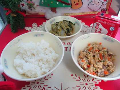 12月15日(水)の給食は,ごはん,牛乳,他人煮,春菊と白菜のごま煮でした。