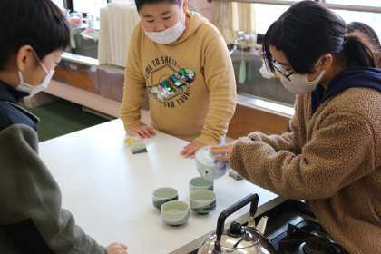 「笑福」の利益から,もう一度和菓子を注文し,5年生でお茶会をしました。宇治のいいお茶を自分たちで入れ,和菓子とともに味わいました。お茶の苦さに驚く子もいましたが,味とその空気を楽しんでいる様子の子どもたちが多かったです。最後は店長,副店長の「美味しい和菓子ごちそうさまでした!」の元気な声で終わりました。みなさん本当にお疲れさまでした。