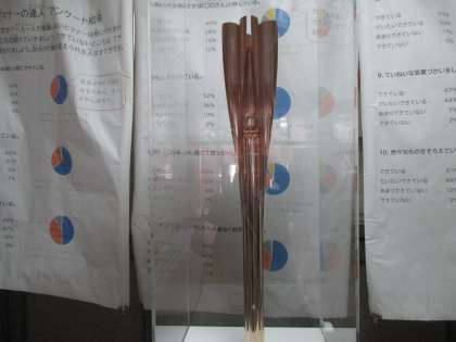 朝から廊下は大騒ぎです。なんと今年のオリンピックの聖火リレーで使われた本物のトーチが飾ってあるからです。桜をモチーフにしてあり,輝いています。なんと,実際に手に持つこともできます。子どもたちは大喜びです。期間限定で借りてきたものです。