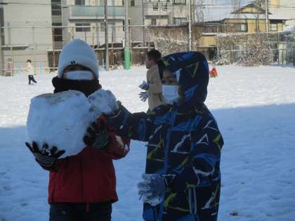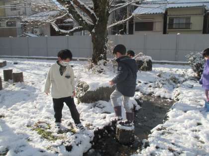 今日はびっくりするほど雪が降り積もっていたので,みんなで雪遊びをすることにしました!運動場一面真っ白で,雪だるまを作ったり,雪合戦をしたりして楽しみました。ドリームワールドにあるビオトープの水にも氷が張っていて,いつもとは違う風景がとても新鮮でしたね。