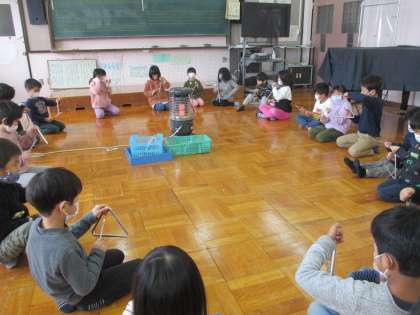 楽器は鳴らし方によっていろんな音に変わります。今日はトライアングルとすずの音を実際に鳴らして確かめました。トライアングルでは「ゆっくりうつと鐘の音みたい!」「早くうつと目覚まし時計の音みたい!」と音の違いに気づくことができました。