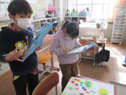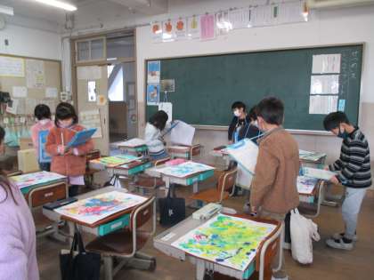 図画工作「うつしたかたちから」でできた作品を見せ合い,友だちの作品の良いところを見つけました。素敵な作品ばかりでしたね。