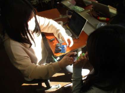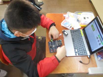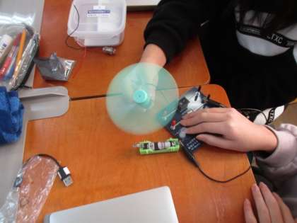 今日は前回の照度センサーに引き続き,人の動きを感知する人感センサーをうまくプログラムに組み込みました。最初うまくいかない場面もありましたが,前回の照度センサーの時を思い出しながら試行錯誤していました。どの班もプロペラを回したり,オルゴールを鳴らしたりすることに成功していました。