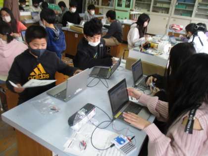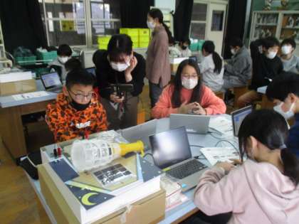 プログラミングでは,5つの課題に対して,思い描いた動作を目指して,コマンドを組み合わせては,試してを繰り返していきました。うまく行かなったときほど,どこにズレが生じているのかと必死に考えていました。2時間の学習があっという間だったと振り返っている子たちも居て,よい機会になりました。