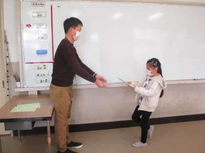 最後は,担任から一人ひとり前に出て完走賞を渡しました。