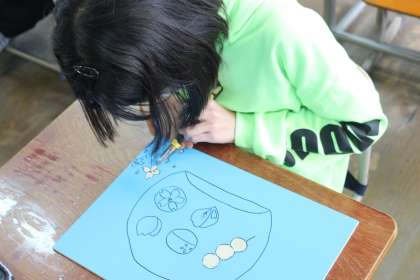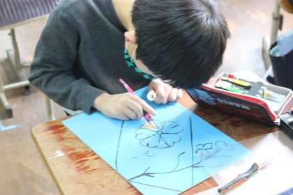 彫刻刀,4年生の時とは違い,線彫りではなく面彫りにチャレンジしています。難しそうにしていますが,徐々になれてきたのか,手際良く彫り進めています。完成するのが楽しみです。