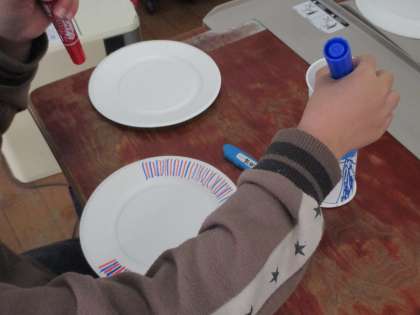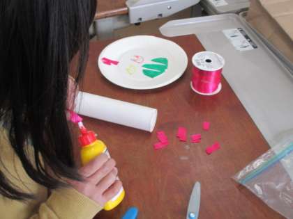 紙皿を使って工作をしています。飾り付けをするときには,転がしたときにきれいに見える模様を描いている人やリボンを巻き付けたりなどそれぞれ楽しみながら作ることができていました。完成したらみんなで転がしたいと思います!