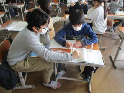 算数の時間には,単元の学習をすでに終えていて,復習に取り組んでいます。それぞれ違う進度ということもあり,クラスでお互いに教え合って解決しています。人それぞれ得意な問題や単元がある中で苦手を補い合うというのは,とても大事なことです。
