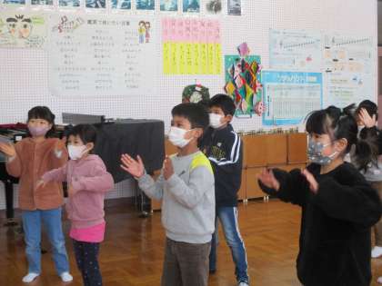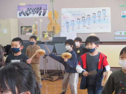 韓国・朝鮮の歌や楽器を使ったダンスを教えていただきました。歌では,子どもたちもノリノリで歌ったり体を動かしたりしていました。「ソゴ」という楽器を使ったダンスに挑戦した子どもたちでしたが,すぐに踊りを覚えていました。とても楽しかったようで,教室でも歌ったり踊ったりしていました。
