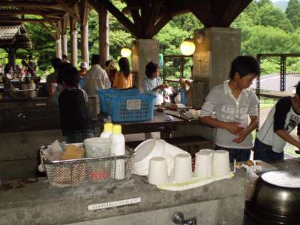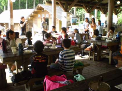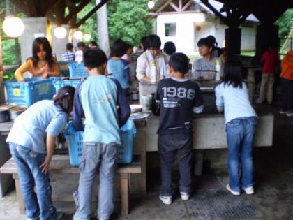 今日の夕食は野外炊事です。5つのグループそれぞれ違うメニューをつくりバイキング式に自由に食べることにしました。各班力を合わせてつくりました。どのグループもおいしくできていました。みんなで完食しました。