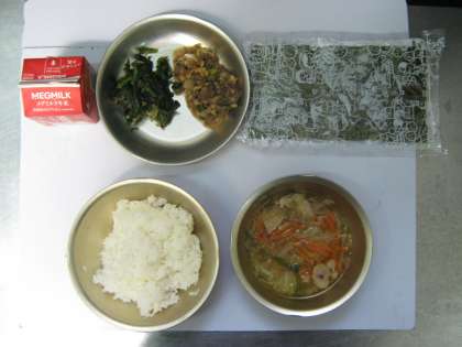 今日の給食は,ごはん・牛乳・肉みそ納豆・ほうれん草のおかか煮・キャベツのよしの汁でした。肉みそ納豆は新しい献立です。昔から食べられていて,血をさらさらにするなど体にいいことがたくさんある納豆を食べてほしい・・・との思いで考えた献立です。納豆といっしょに牛ひき肉やたまねぎ・青ねぎをいためて,さとうや赤みそ・トウバンジャンなどで味付けしたものです。