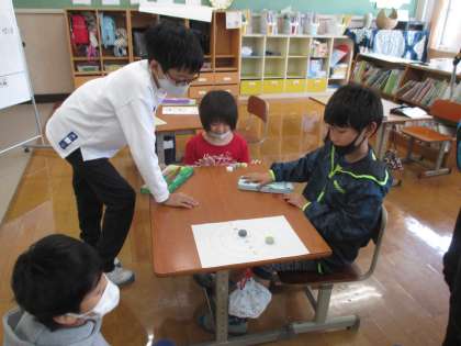 今日の算数は,的あてゲーム。0点・5点・10点・20点・100点のマスに何個ペットボトルキャップが入ったか,合計得点で点数を競いました。ゲームをすると,0点は何個あっても0点ということがわかりやすいですね。