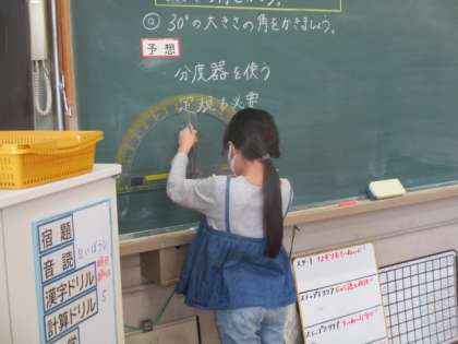 今日から算数の学習では,これまでの学習と少し視点の変わった問題に取り組み始めました。これまでは角の大きさを測ったり,計算したりすることが中心でしたが,今日は,角を作図する問題に取り組みました。測るときよりもより正確な操作が求められます。ノートにもていねいに作図する習慣がついてきました。これからもたくさん分度器を使って,慣れていけるようにしていきたいと思います。