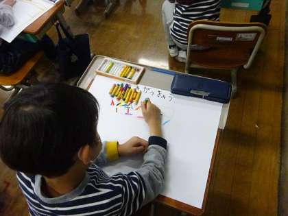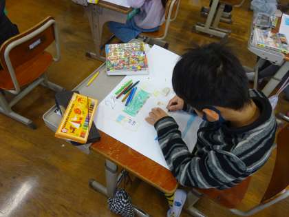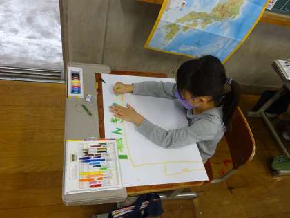 1年生に学校をあんないするために,それぞれのきょうしつの しょうかいポスターをつくっています。