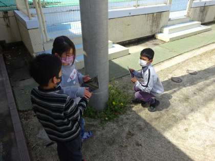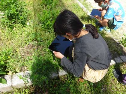 タブレットをもって,うんどうじょうにさいている花のしゃしんをとりに行きました。