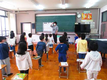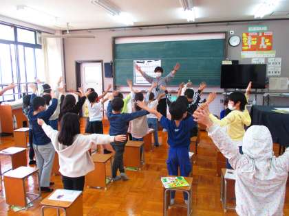 3年生の音楽の交流の様子です。たっぷり息を吸うには,どんな姿勢がいいのかな。良い姿勢で歌うと良い声が出ますね!