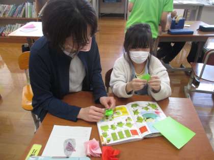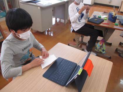 図工で折り紙をしました。絵本やタブレットで作りたいものを見つけ,ていねいに折っていきました。作りたいものを作り上げた,満足そうな笑顔が印象的でした。