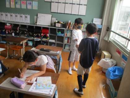 今日は外国語の時間に世界の国々のいろいろなこんにちはを勉強しました。授業の後半には英語のこんにちは「Hello」を使って友だちとあいさつビンゴを作りました。次回の時間にみんなで楽しくビンゴをしようと思います。