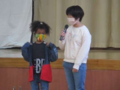 全校集会で学級代表のあいさつを行いました。