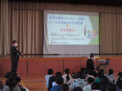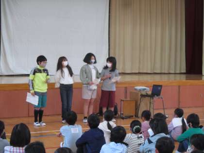 5月のにこにこ集会がありました。5月は「憲法月間」です。にこにこ集会では,だれもが楽しく気持ちの良い生活を送るためにはどうすればよいのか,を考えてもらいました。