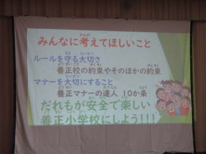 ルールを守る大切さ,マナーを大切にすることについてこの1か月,しっかり考えてほしいと思います。