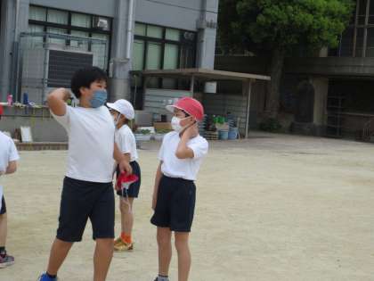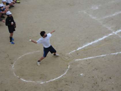 6年生は投げる前に,3年生に投げ方のコツを教えていました。