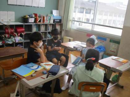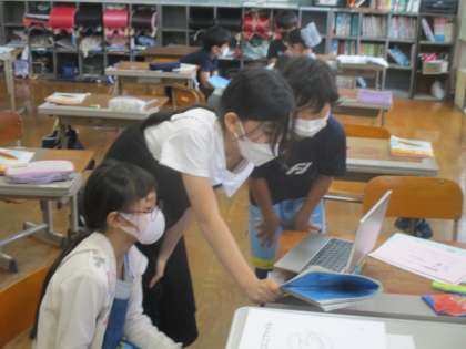 いろいろな教科の中で,グループ学習に力をいれています。お互いの考えを共有したり,悩みや困りを解決したりする中で,みんなで力を伸ばしていくことを目的としています。自分で考えを書き込んだノートやGIGA端末などを活用しながら学習を進めています。