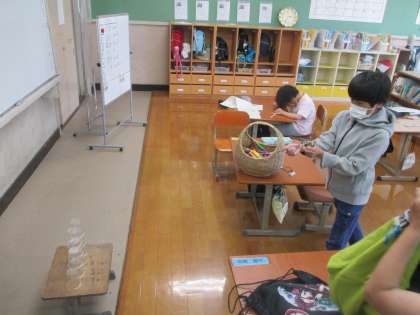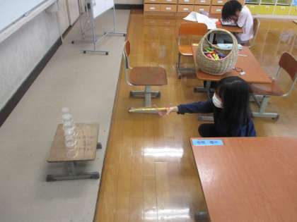 完成した輪ゴム鉄砲で的当てゲームをして楽しみました。