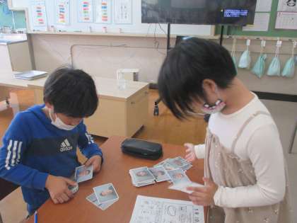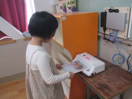先生クイズでつかうカードを作成中です。ラミネートをしたり,1年生がけがしないように道具を使ってカードの角を切り落としたり。楽しんでもらうのが楽しみですね。