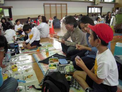 走ること,くぐること,選ぶこと,貼ることなどさまざまに工夫された競技に元気に参加しました。また,お昼のお弁当は体育館でおうちの方と一緒でしたから,余計においしかったようです。