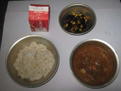 今日の給食は,麦ごはん・牛乳・カレー・ひじきのソティでした。今日の献立は,食べる時間も早く,残ることなくきれいに食べました。給食室からいいにおいがただよってくると,「今日はカレーや・・・」と喜んでいました。