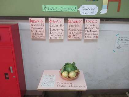 今日は,春野菜を使った献立だったので,給食室前に春野菜を展示しました。春においしいじゃがいもやキャベツ,玉ねぎはあま味があり,みずみずしくてとてもおいしいです。興味津々で手に取って,においをかいでいた子どもたち。ぜひスーパーに行ったときにでも春野菜の仲間を探してみてくださいね!