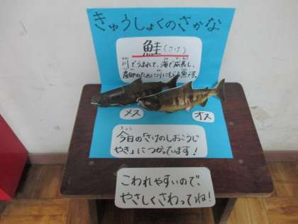 給食室前では,明日の「さけの塩こうじ焼き」にちなんで,さけの紹介をしています。明日ぜひ見にきてくださいね!