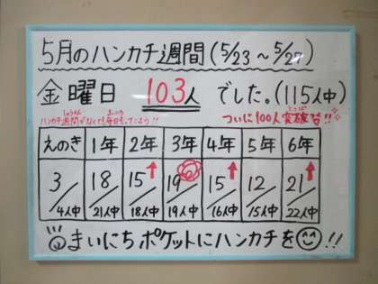 今日はハンカチ週間最終日でした。なんと115人中,103人の人がハンカチを持ってくることができていました!100人を超えて,委員会の子どもたちだけでなく,保健室前を通る子どもたちからも「あ!ついに100人超えた!」「すごい!」など喜びの声が聞こえてきました。