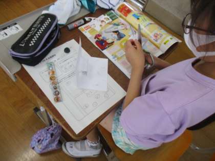 今日から図工で新しい単元の学習が始まりました。カードでつたえる気持ちという単元で,切込みを入れたり,画用紙を貼ったりして飛び出す仕掛けを使ったメッセージカードを作ります。今日は,作り方の紹介動画や作品例からアイデアスケッチをした後,実際に仕掛けづくりの練習をしました。試していく中で新たないいアイデアも出てきて,次回の作品作りがとても楽しみな様子でした!