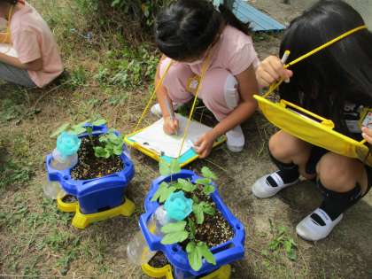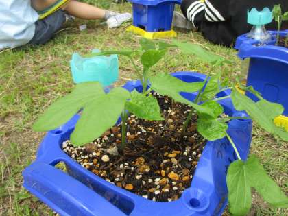 毎日水をあげたアサガオが大きくなりました。あんなに小さい種がこんな大きな芽をだすことに驚いていました。葉がぶつぶつだったり,色が違うところがあるなど,よく観察することができました。