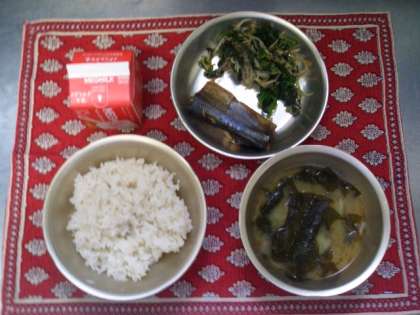 今日の給食は,麦ごはん・牛乳・さんまのしょうが煮・ほうれん草ともやしのごま煮・みそ汁でした。じゃがいも,たまねぎ,わかめが入った具だくさんのみそ汁でした。