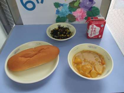 チキンカレーシチューは久しぶりの登場です。いつも給食に出てくるカレーよりもカレー粉が少ないので,マイルドな味でパンともよく合います。