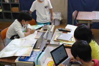 社会科の学習で京都市の様子について調べています。お店が集まっているところ,お寺や神社の集まっているところなど,グループに分かれて様子を探っています。校区とは全然違う様子や,新たな気づきに良い反応を見せてくれる子どもたちです!