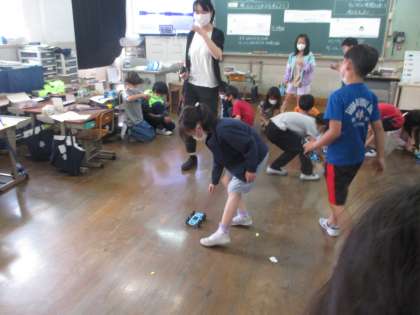 車を組立て,ゴムの力で車を動かしました。上手に組立てられていたので,しっかり車が進みました。このゴムの車を使って学習を進めていきます。