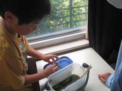 えのき学級で育てていたヤゴが週末の間に羽化し,教室で元気に子どもたちを出迎えてくれました。とてもきれいなギンヤンマでした。たっぷり観察し,中間休みに自然へかえしました。自然の中で元気に過ごしてほしいと思います。