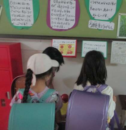 給食室前に,トマトとピーマンを展示していると,たくさんの子がさわりに来ていました。今日の給食はチンジャオロースーとトマトとたまごのスープでした。にがみのあるピーマンやさっぱりとしたトマトをおいしく味わって食べました。