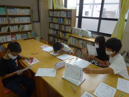 今日の図書委員会では,クイズラリーの丸付けや,答えの作成を行いました。