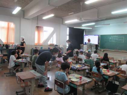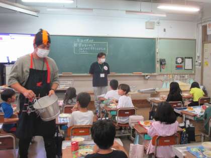 給食調理員さんが教室へ行って,子どもたちが食べている様子を見たり,子どもに声をかけたりされていました。作っている人からのメッセージって力強いですね。子どもたちも一生懸命聞きながら,感謝の気持ちで給食を食べていました。